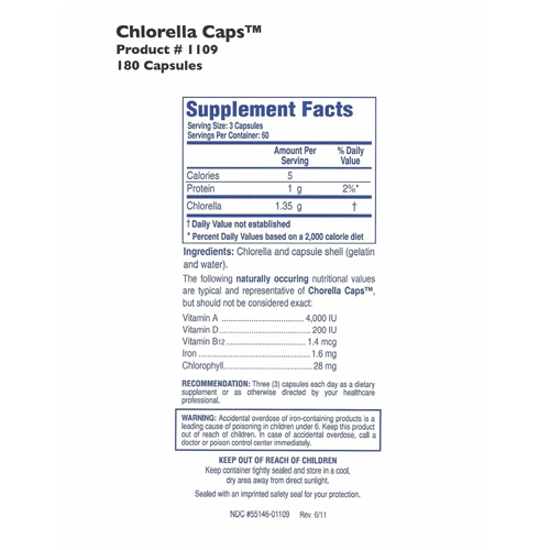 Chlorella. Chlorella also contains other naturally occurring ingredients, including Vitamin A, Vitamin D, Vitamin B12, Iron, and Chlorophyll.